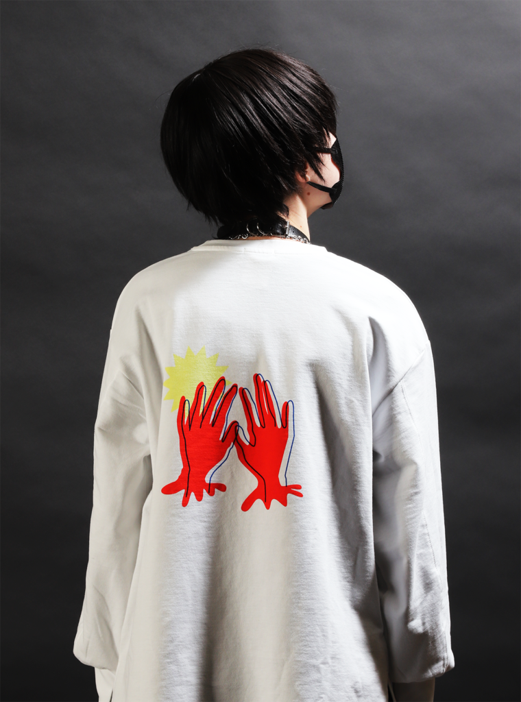 印刷実習の課題で、透明インクを使い3 つのレイヤーに分けて刷るという条件のもと制作しました。この課題では透明インクならではの、色の変化を見ることが出来るようなデザインにするために手と手袋にし、ポップな印象にするための効果として棘のある円を入れました。